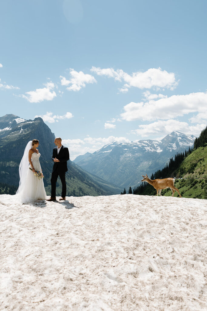Next, we traveled up Going-to-the-Sun Road and stopped at one of my favorite locations in the park. Earlier in the season, an avalanche had left a large snowbank that was still there in the middle of July! As a result, their images took on a fun and adventurous feel. I loved the contrast between the rugged mountain landscape and the bright white snow — it gave their photos such a unique Glacier National Park look. Halfway through, we even had a surprise guest join us when a deer wandered into a few of their photos, giving them the true Glacier Park experience.